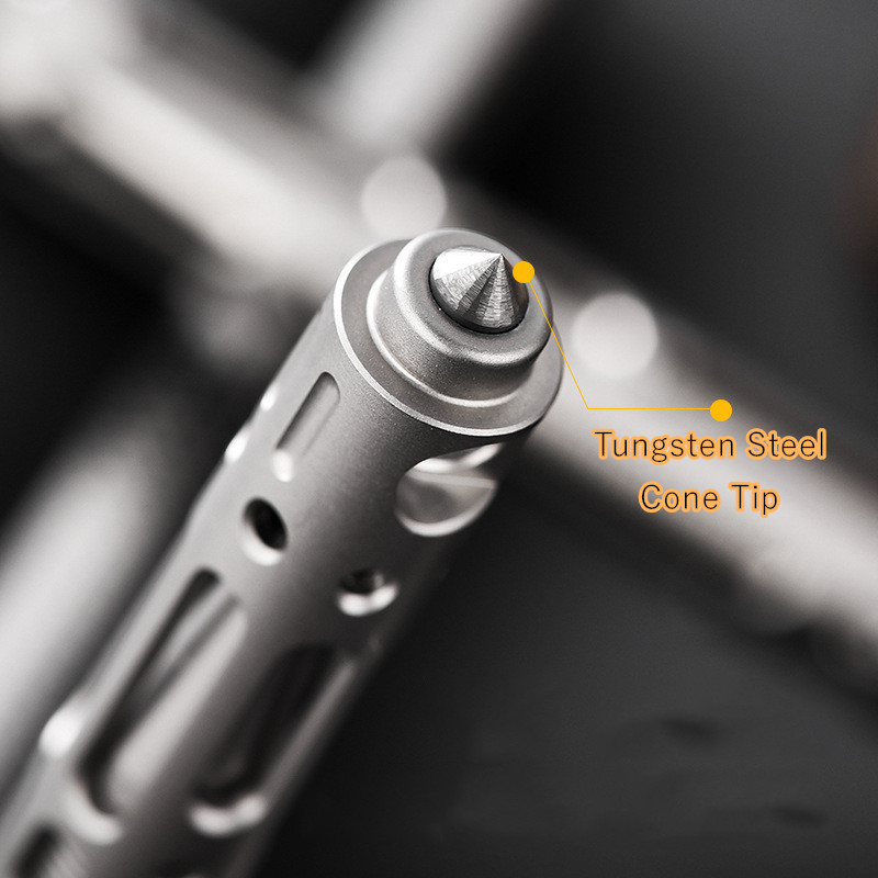 The pen is equipped with a ballpoint refill that uses fast-drying, waterproof oil-based ink, providing a smooth and uninterrupted writing experience. Its ergonomically designed grip features anti-slip grooves, offering comfort and control during writing or tactical use. The high-hardness tungsten steel cone tip (rated at 90HRA) serves as a window breaker and a hidden, discreet self-defense tool, capable of leaving scratches on glass and breaking it during emergencies.